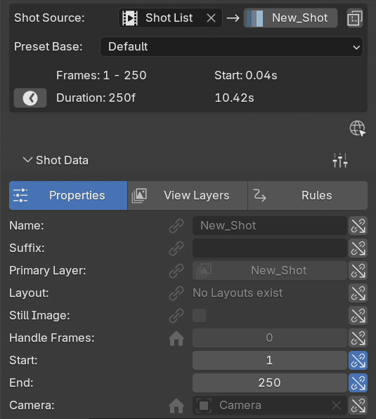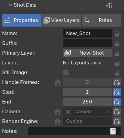 If the source Shot is a Default shot then Name and Suffix must be unique, Primary Layer defaults as the active View Layer when the shot is created, Still Image is borrowed from the Default Shot but is not linked.