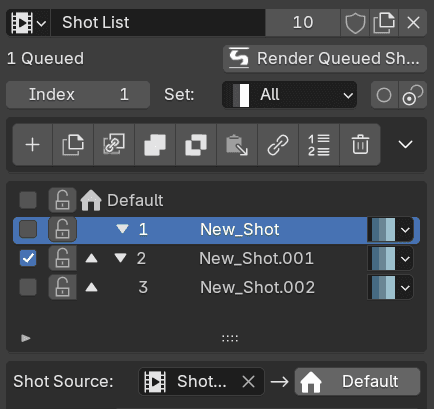 Each Shot List contains a Default shot which acts as a basis for all other shots.