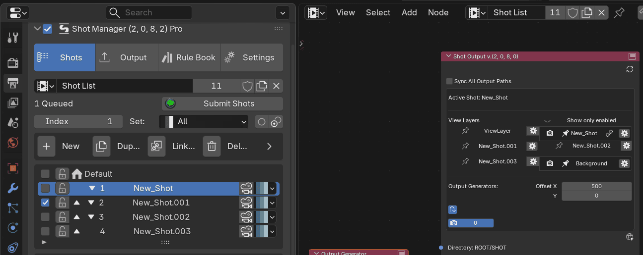 The Shot List data-block consists of two components, the essential shot list and the optional output node tree.